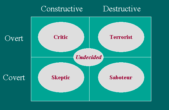The Constructive axis reflects individuals who are in basic agreement with the project, but are resistant to aspects of the implementation; Destructive behavior is opposed the plan at its core. Overt/Covert resistance is self-explanatory.