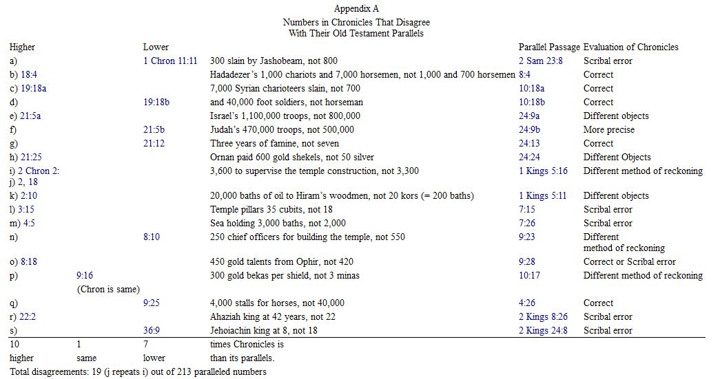 Now, on the subject of differences in the OT text —with specific disagreements between Chronicles and the parallels in Samuel/Kings—we should note first that the number of disagreements is small. Here is a chart of the differences in numbers, with their probable origin (from EBC).