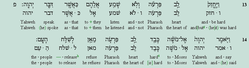 "It is to be noted that in the first five plagues Pharaoh's obduracy is self-willed. It is only thereafter that it is attributed to divine causality. This is the biblical way of asserting that the king's intransigence has by then become habitual and irreversible; his character has become his destiny. He is deprived of the possibility of relenting and is irresistibly impelled to his self-wrought doom." [ They translate 7.13 as “Yet Pharaoh’s heart stiffened and he did not heed them, as the Lord has said”]
