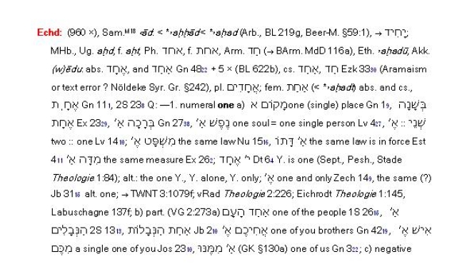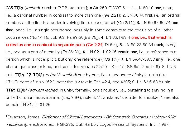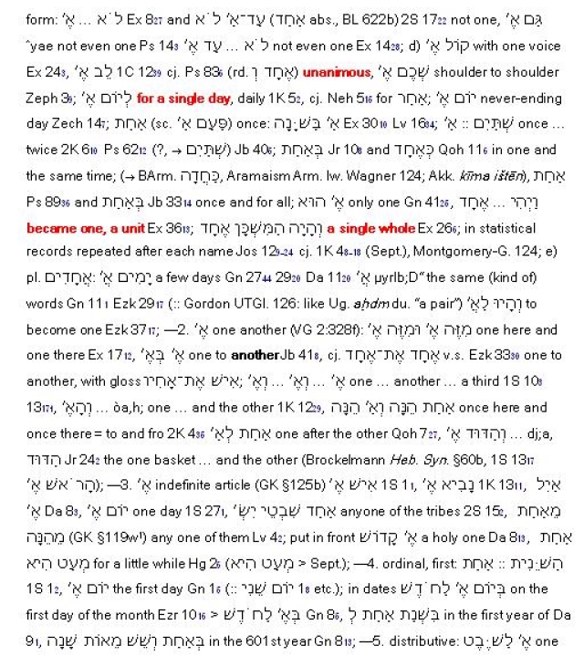 3. But EVEN IF this echad is understood as meaning 'one', it is well documented that this 'one' can be a composite unity. Consider entries from some standard linguistic tools: