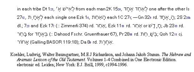 Third is: Koehler, Ludwig, Walter Baumgartner, M.E.J Richardson, and Johann Jakob Stamm. The Hebrew and Aramaic Lexicon of the Old Testament. Volumes 1-4 Combined in One Electronic Edition. electronic ed. Leiden; New York: E.J. Brill, 1999, c1994-1996.] [Sorry, only in disconnected jpgs...sigh]